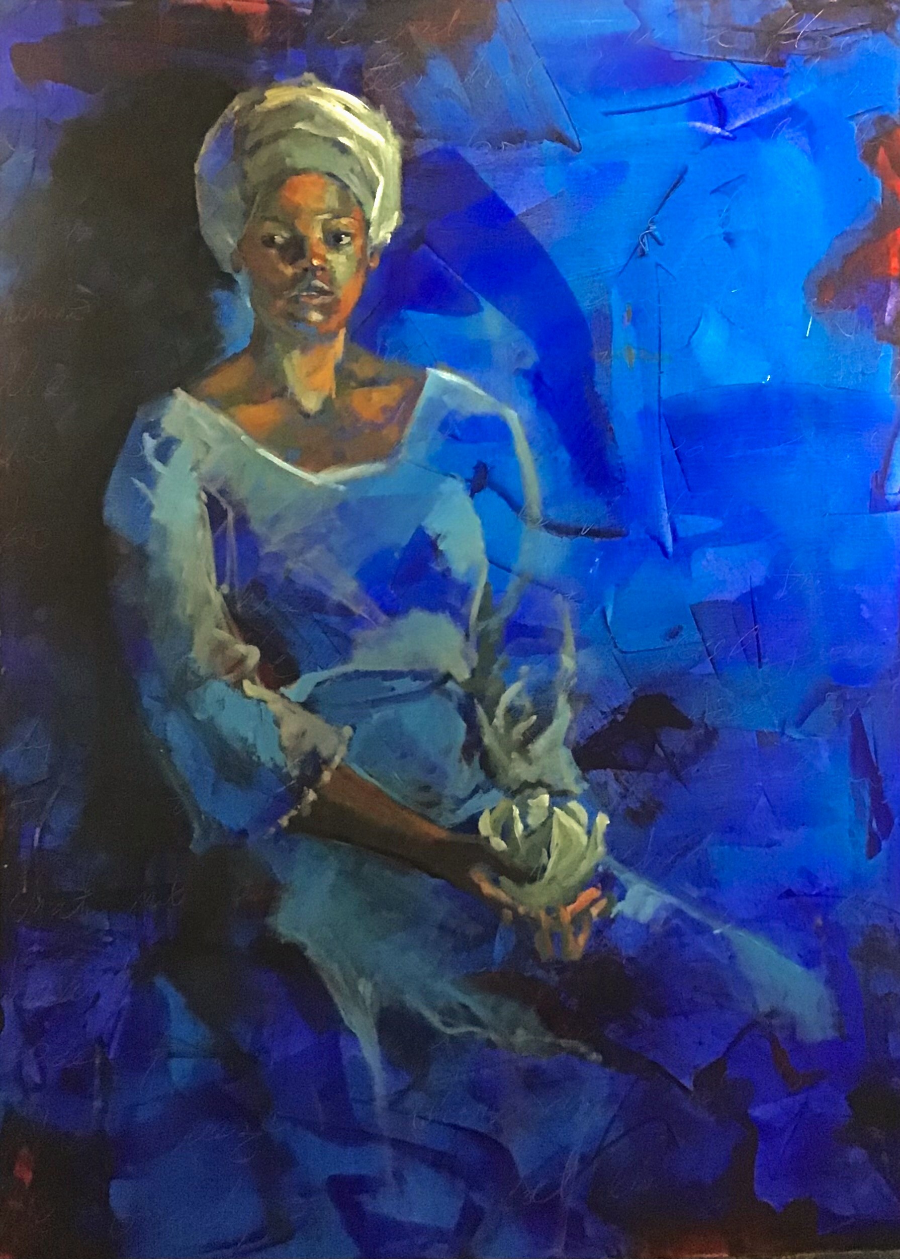 This large oil painting of Jeanne Kilongo, by Hilda Rueda, was recently given to the Salem Art Association Permanent Collection by Nadene LeCheminant and is on display until February 22, 2026. Nadene notes: